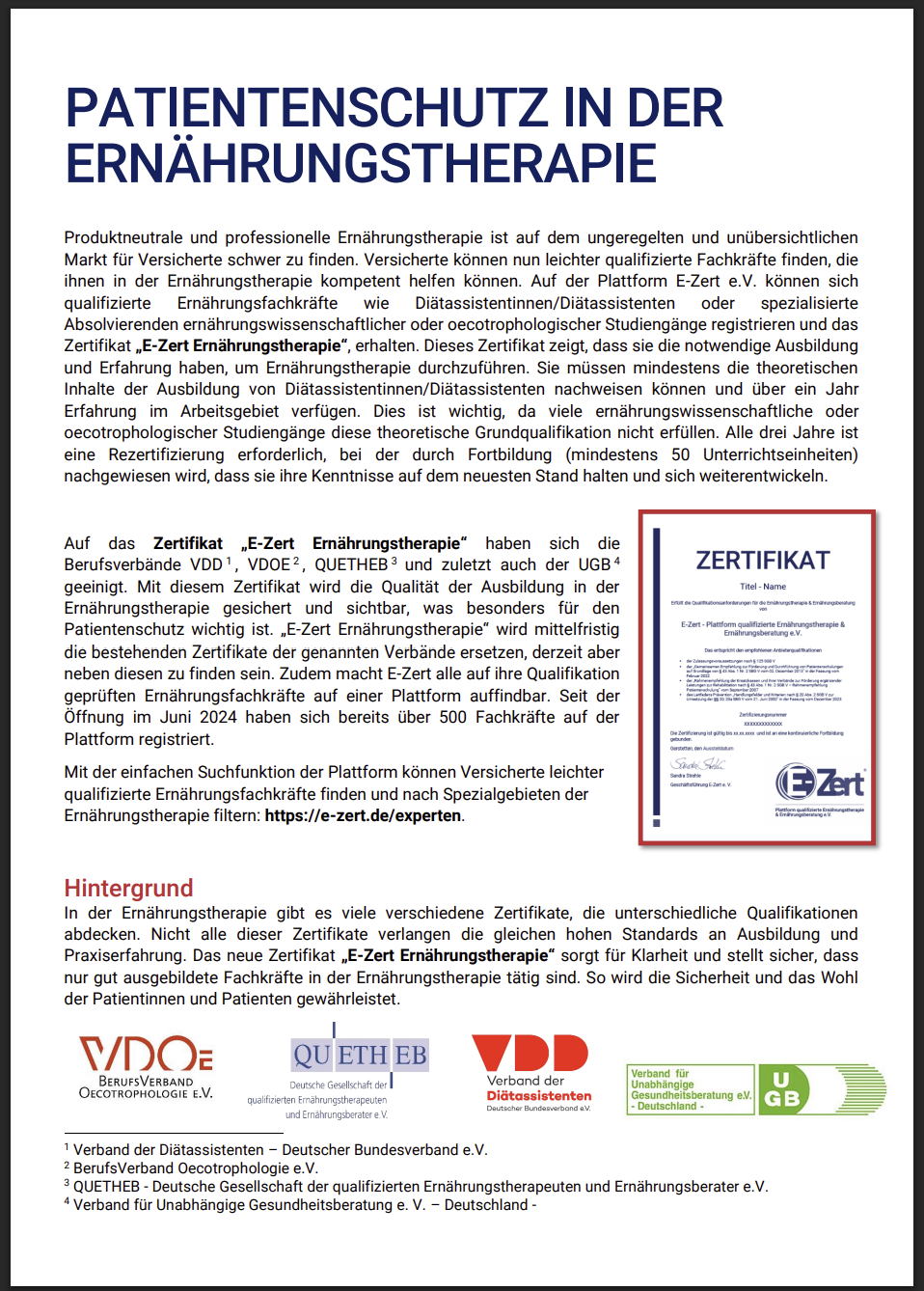 Der E-Zert e. V. (Ernährungsberatung und -therapie Zertifizierung e. V.) ist ein unabhängiger Verein, der hohe Standards in der Ernährungsberatung und -therapie setzt. Das Siegel des E-Zert e. V. garantiert: